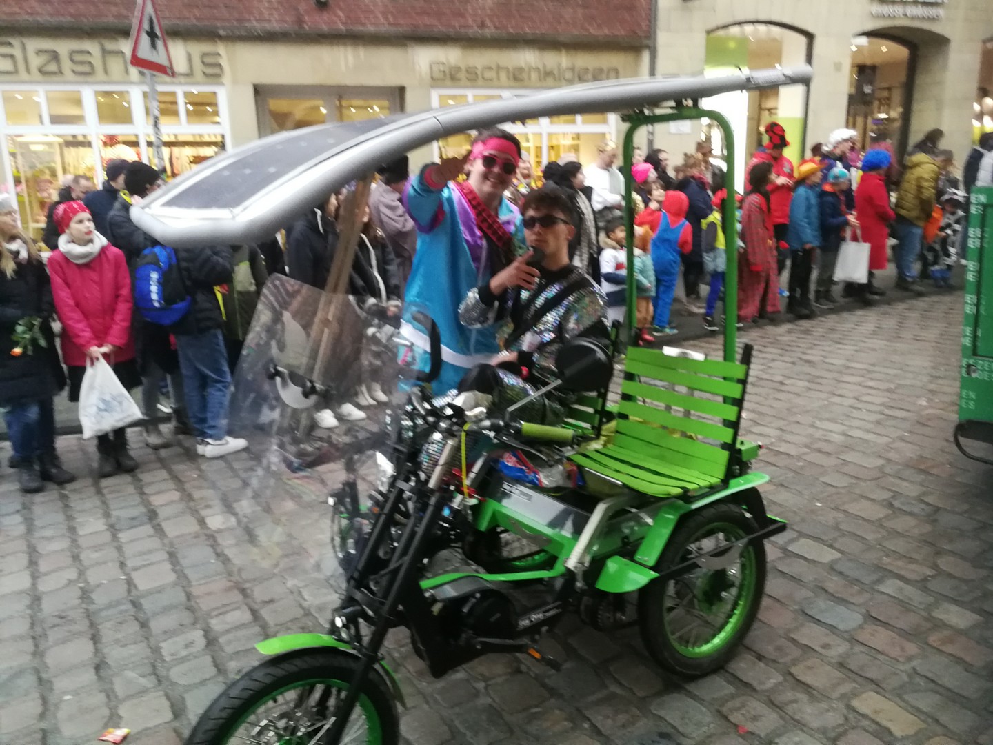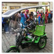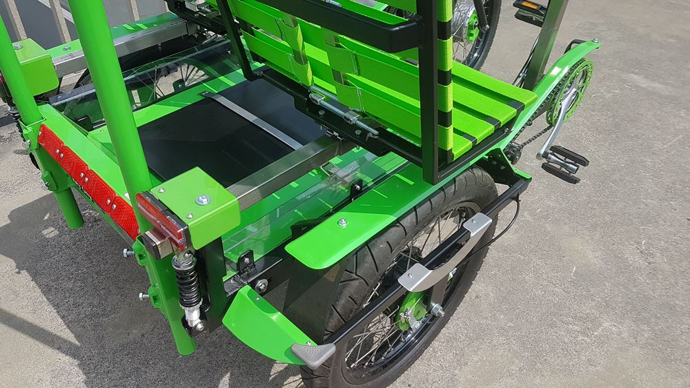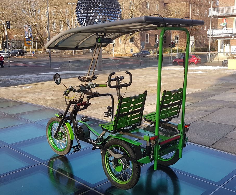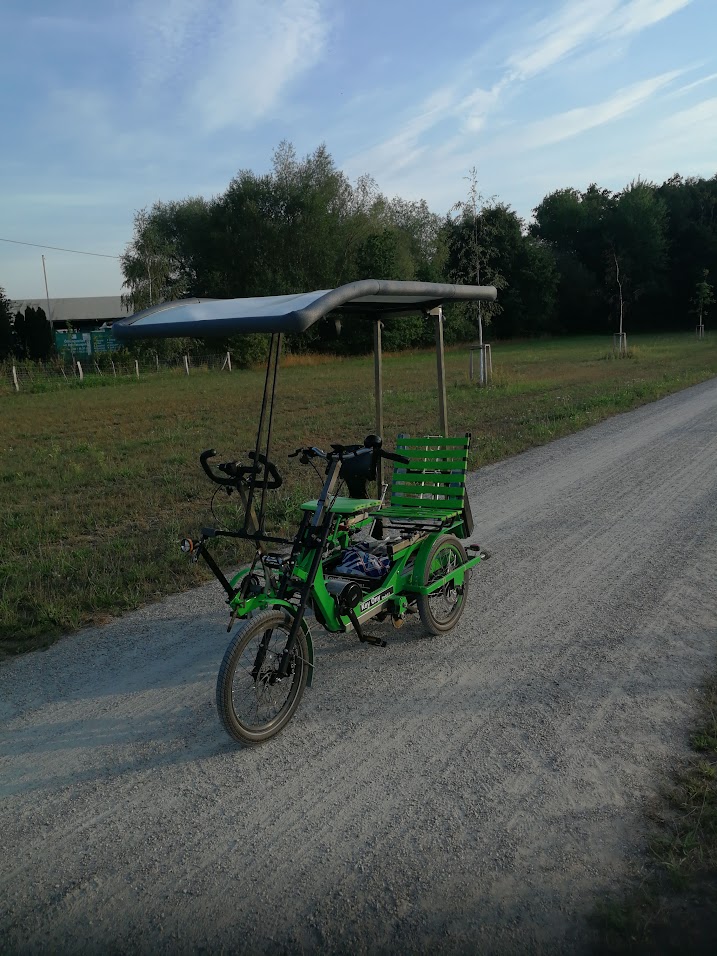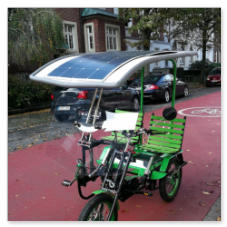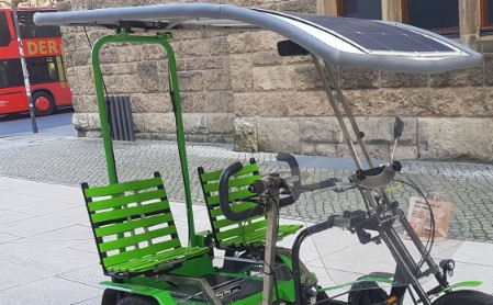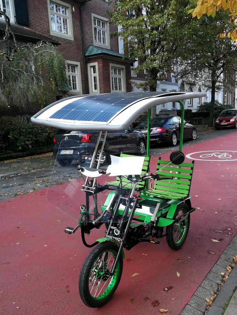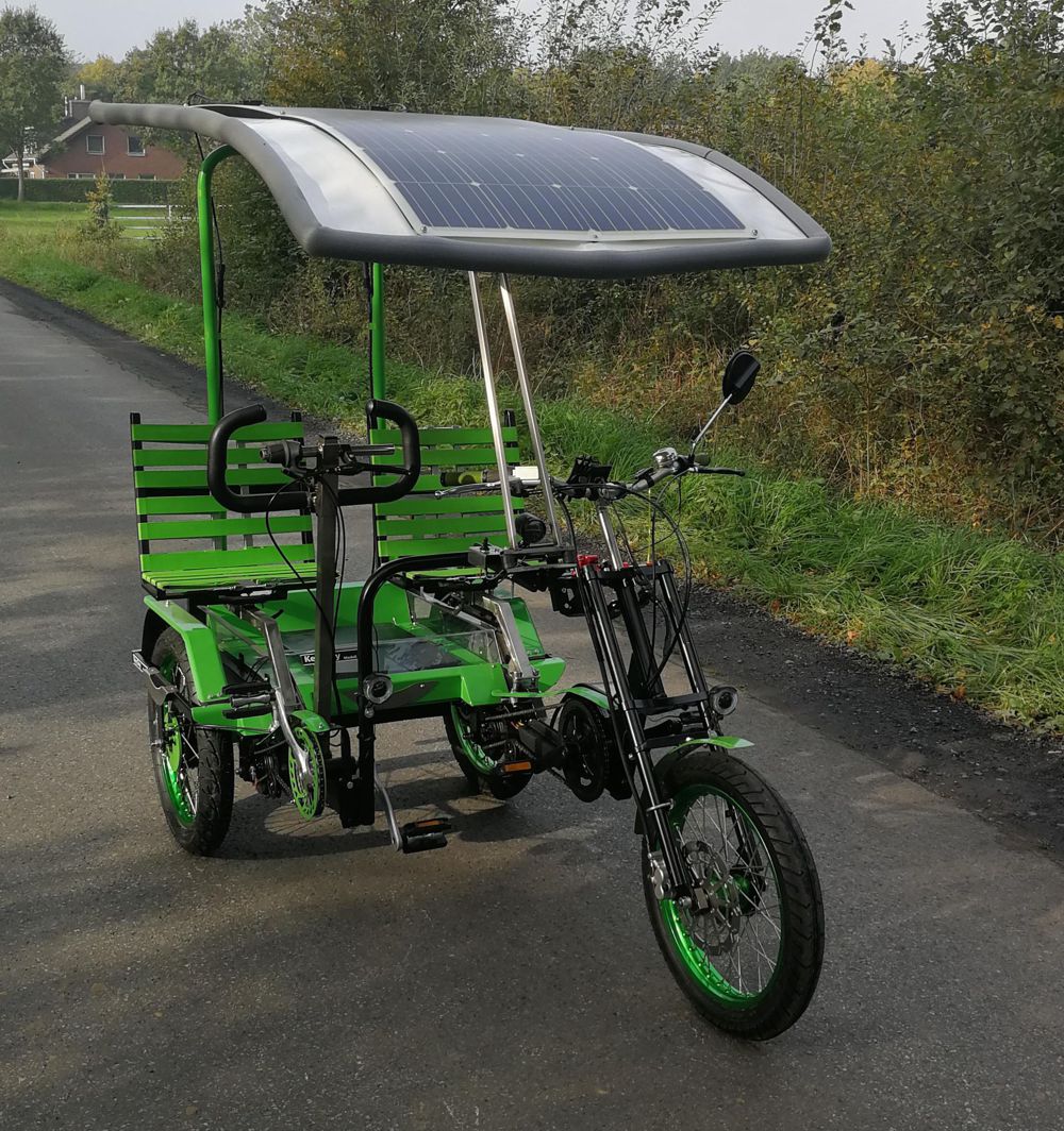 Das Allwetter Dach ist mit Gummidämpfern flexibel montiert, ein 175W Solarmodul lädt bei sonnigem Wetter die Akkus des Dreirad Tandem s .Ein Laderegler sorgt für die richtige Ladespannung.